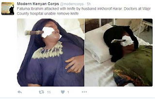 According to twitter user Modern Kenyan Corps, this woman. Fatuma Ibrahim was stabbed in the face by her husband.